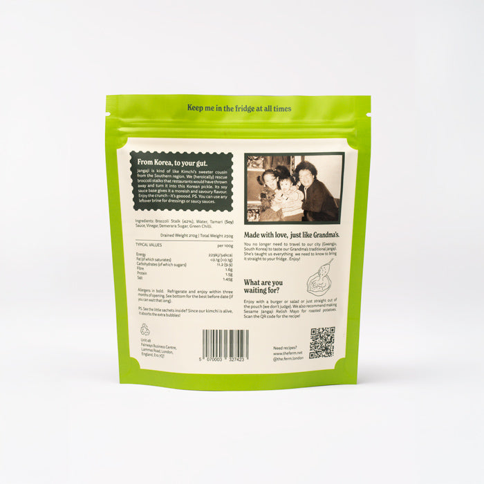 Jangaji is kind of like Kimchi’s sweeter cousin from the Southern region. We (heroically) rescue broccoli stalks that restaurants would have thrown away and turn it into this Korean pickle. Its soy sauce base gives it a moreish and savoury flavour. Enjoy the crunch - it’s gooood. PS: You can use any leftover brine for dressings or sauces.